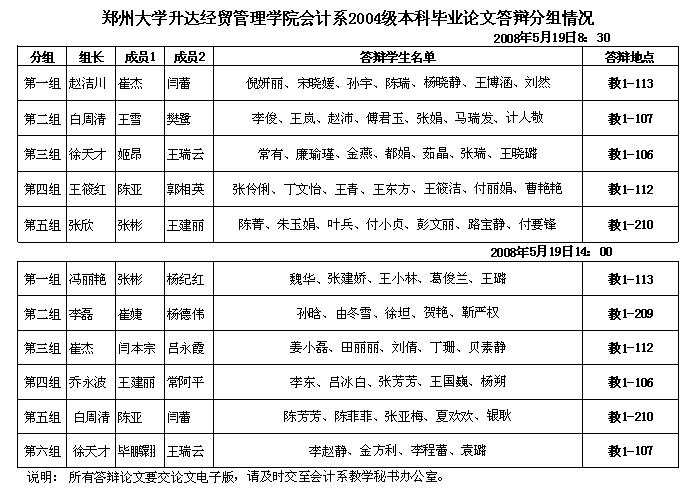 根据学院本科毕业论文工作日程安排,会计系“毕业实习和毕业论文”工作领导小组院定于2008年5月19日上午8:30-12:00,下午2:30-5:30进行论文答辩,请相互转告。具体答辩的时间、地点如下: