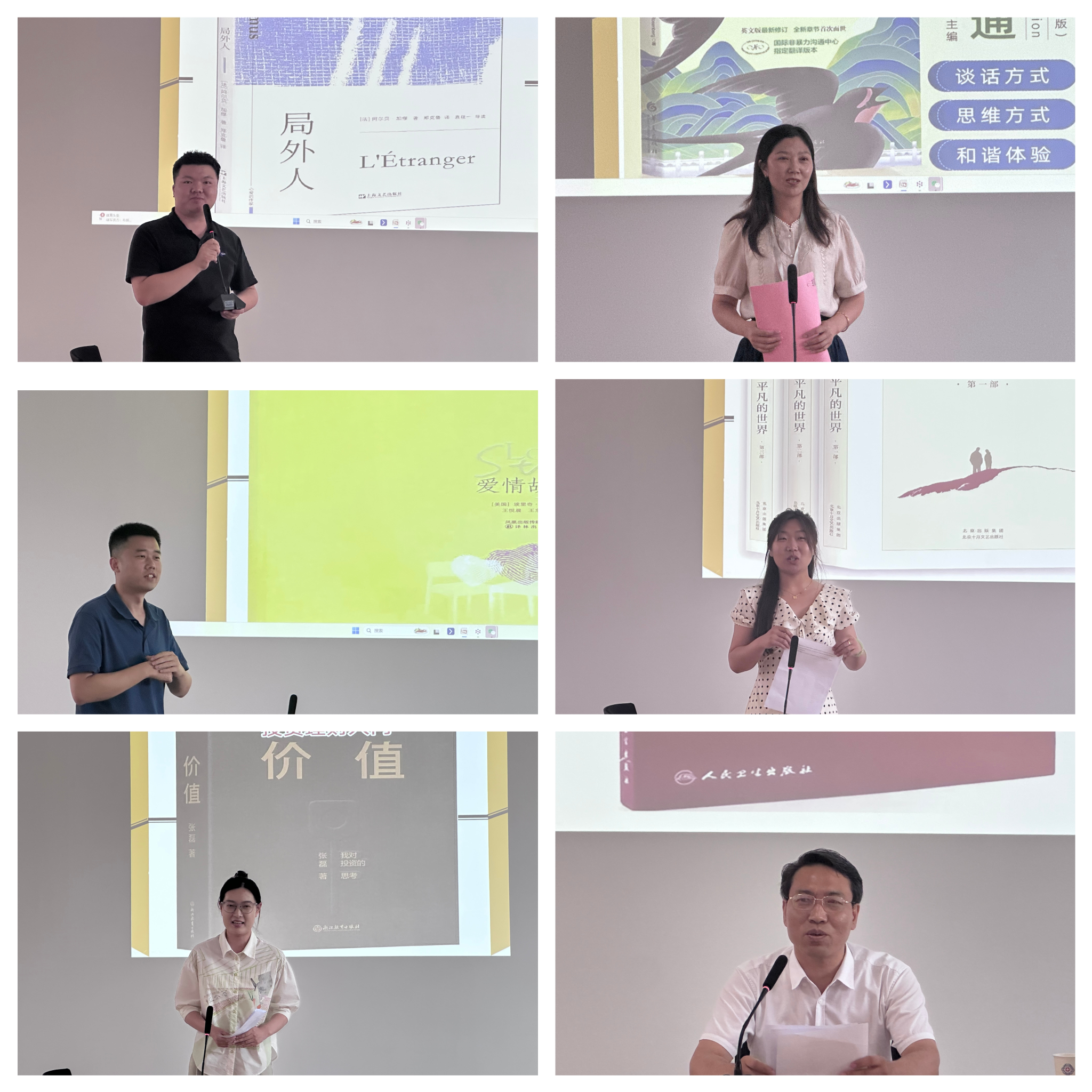 学院统战委员陈姣分享了《非暴力沟通》的读书心得,从书中“观察、感受、需求、请求”的沟通四要素,举例说明如何将非暴力沟通技巧运用于师生交流与教学管理中,她讲到,“当我们用同理心倾听学生诉求,教育便有了更温暖的底色。”其分享引发在场教师对沟通艺术与教育实践融合的深度思考;朱祥老师以《局外人》为引,探讨现代社会中个体的存在意义与教育者的价值坚守;孟嘉玮老师从《爱情故事》出发,结合心理学视角解析亲密关系中的情感表达与教育同理心的关联;白建慧老师深情讲述《平凡的世界》中人物的奋斗历程,畅谈书中“苦难与成长”对教师职业信念的启示;马玉滢老师解读《价值》中的投资思维,引申至教育工作者对学生成长“长期价值”的关注与培育;民主党派人士代表张雪同老师分享了《中国居民膳食指南(2022)》一书,并结合亲身经历,倡导大家关注饮食健康,并强调通过科学、均衡的饮食习惯来提升生活工作质量。