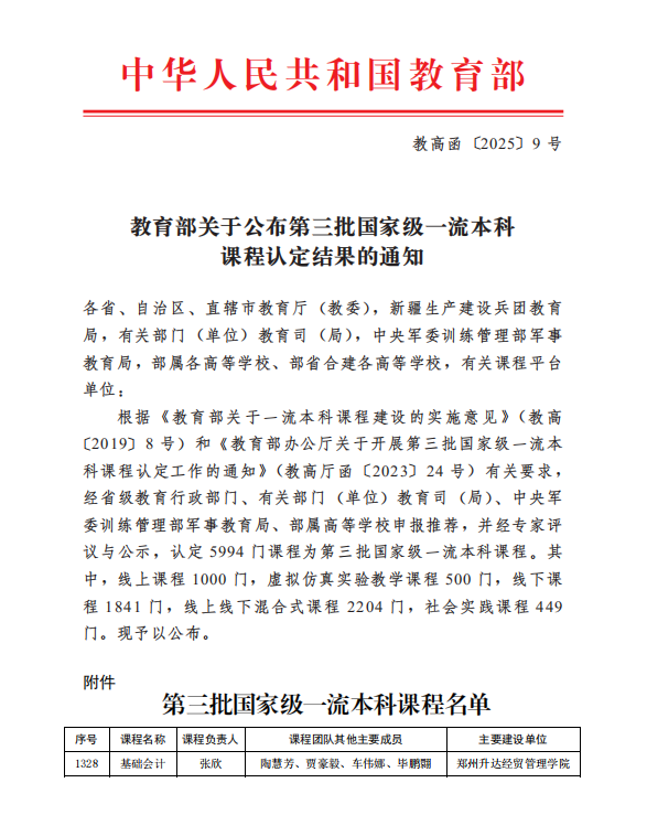 近日,教育部发布了《关于公布第三批国家级一流本科课程认定结果的通知》(教高函〔2025〕9号),我校校长张欣教授主持的《基础会计》课程(团队成员:陶慧芳、贾豪毅、车伟娜、毕鹏翾)被认定为“国家级线上线下混合式一流课程”。这是继2023年我校两门课程获批第二批国家级一流本科课程后,在课程建设领域取得的又一重大标志性成果。
