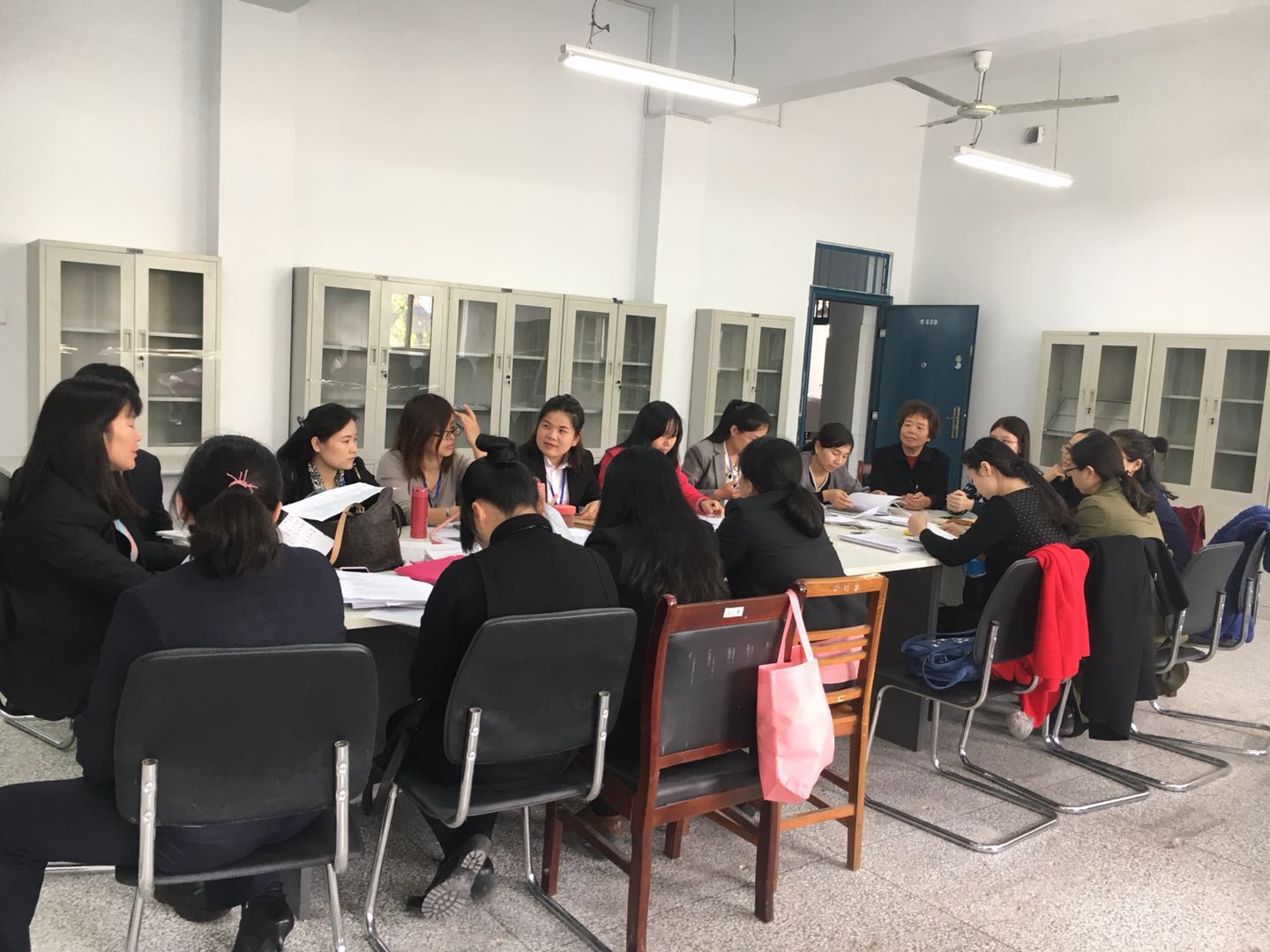 然后,按照车老师的安排大家对所检查老师的教案和讲稿进行了认真的查阅,一边在笔记本上手工记录典型章节的优缺点,一边还用手机拍照,准备回去后再仔细研读学习。讨论阶段,常明珠老师提出:“以后能不能理论课老师检查理论课资料,实验课老师检查实验课资料?以便更高效的检查与学习”,樊璐老师感觉宋万锋老师的教学资料特别好,建议大家都看看。于是大家积极翻阅,点头称赞,宋老师的不仅教案填写完整,小结与教学反思深刻,而且用铅笔批注了讲授每一个问题的所需时间,宋老师的讲稿内容详实,图文并茂,每一节开始都有教学目标,教学难点,最后都有小结,体系特别清楚且完整,宋老师的字也写的特别漂亮,整体让人看了耳目一新,甚至赏心悦目!
