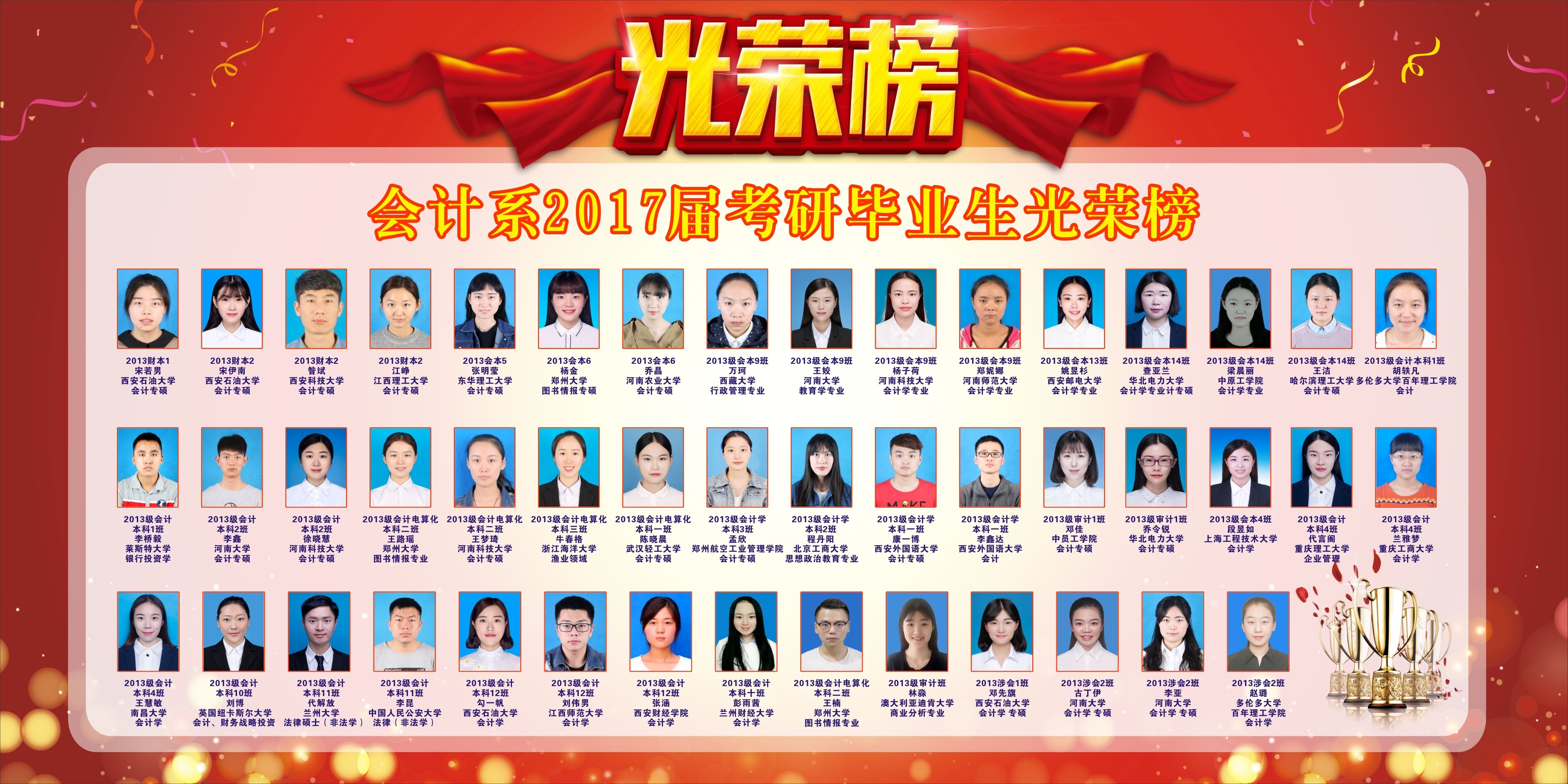 在研究生考试中,我系共有46名同学考上了研究生,其中既有兰州大学等985院校,也有郑州大学等211院校。学生所录取的专业以会计专业为主,同时也有法硕、经济管理和教育学等适应市场发展和学生个性化发展需求的专业。考取研究生的同学每人都获得学院颁发的“考研奖”两千元奖金,以资鼓励。