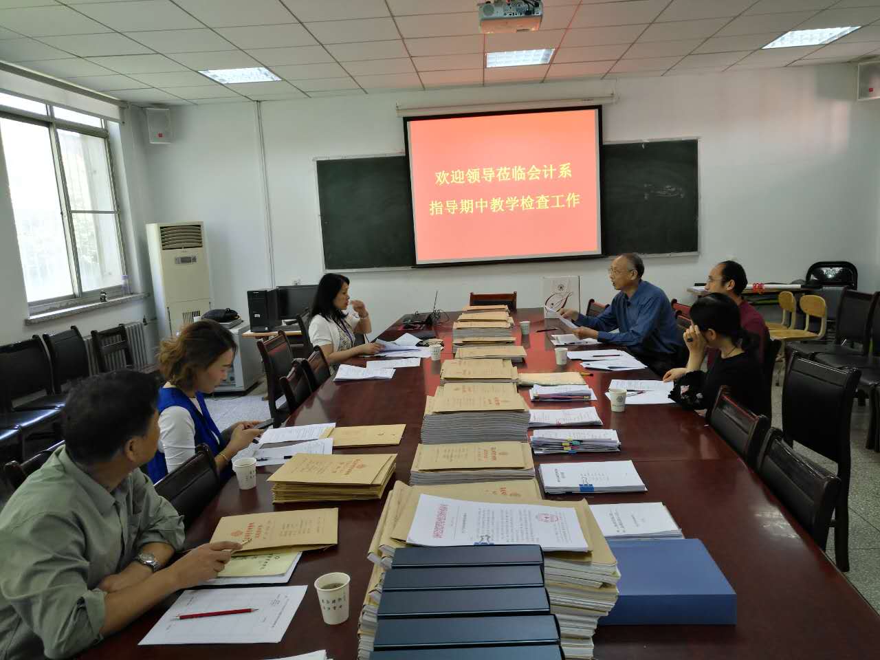 根据学院教务处关于开展期中教学检查的通知要求,5月16日上午以叶定国教授为组长,寇玉琴 、祁术洪、窦峰、程敏姿、赵丹、章泓为成员的学院期中检查小组莅临会计系进行本学期的期中教学检查。本次期中教学检查的重点检查内容为教学保障运行情况、期末试卷归档整理工作和教研室开展活动情况。