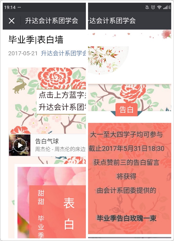 此次活动面向大一至大四学子,每一个人都可以表达自己心里面的话语,同时本次活动也鼓励大家可以将自己的秘密勇敢的讲出来。截止2017年5月31日18:30,获点赞前三的告白留言,将获得由会计系团委提供的一束毕业季告白玫瑰。