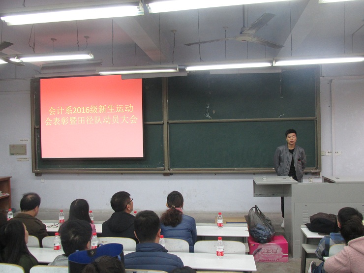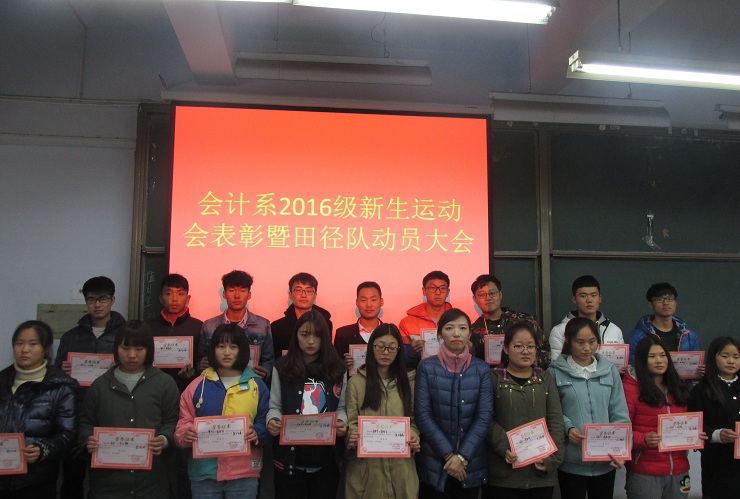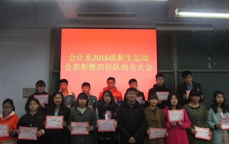 为增强学生身体素质,活跃校园气氛。11月1号中午12:10,由会计系团委主办、会计系体育部承办的“会计系2016年新生秋季运动会表彰大会暨新一届田径队成立大会”在教学楼一号楼111教室举行。莅临本次表彰大会的领导嘉宾有:会计系行政秘书兼团委书记陈刚老师、会计系行政秘书刘锦老师,16级团总支书记、辅导员蔡艳丽老师,16级辅导员刘叶青老师、许震老师、王麓锋、郑杰老师、康威老师、刘伟丽老师及邱猛老师。