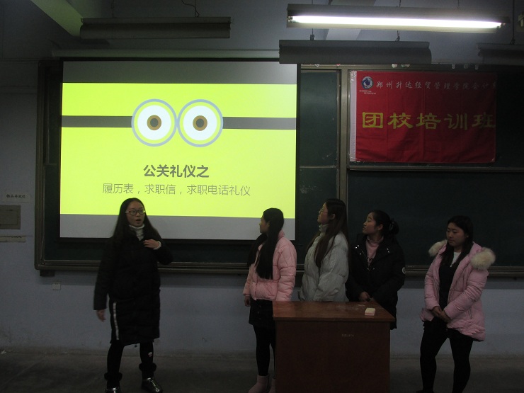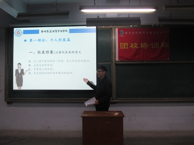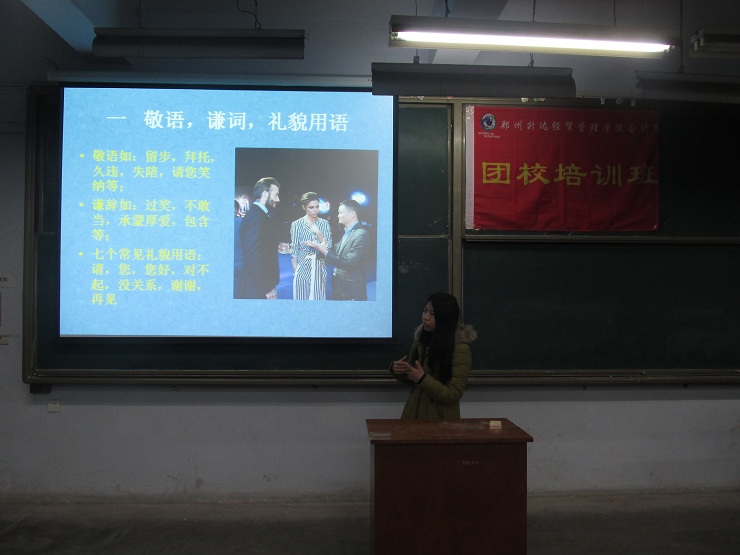 为了提高团校班青年的自身修养和个人形象,更好的促进团校班青年的全面发展。11月24日晚6:30,会计系团校培训班公关礼仪培训活动在教学一号楼111教室举行。团校班班主任代新元、赵思秦、董雪、张奥以及团校班全体学员参与了本次活动。