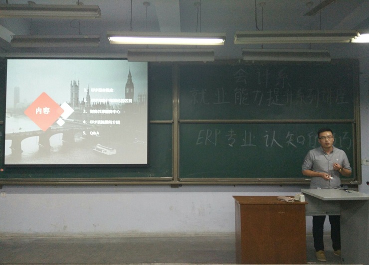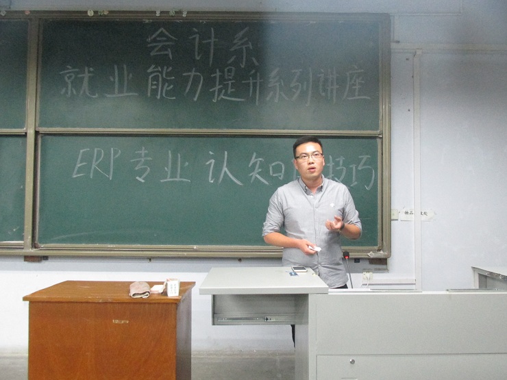 为提升会计系毕业生的就业竞争力,给学生创造更多提升就业能力的机会。10月19日晚上6:30,会计系邀请ERP高级项目经理、ERP高级实施顾问、ERP高级讲师祝涛先生,在教学一号楼111教室举办专题报告会,出席此次讲座的嘉宾有会计系行政秘书兼团委书记陈刚老师。