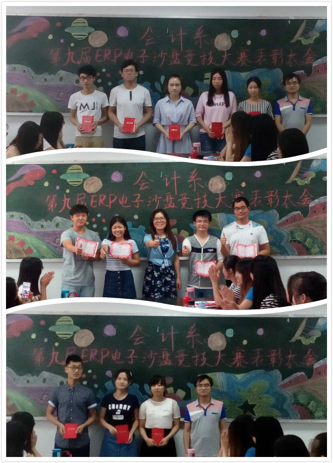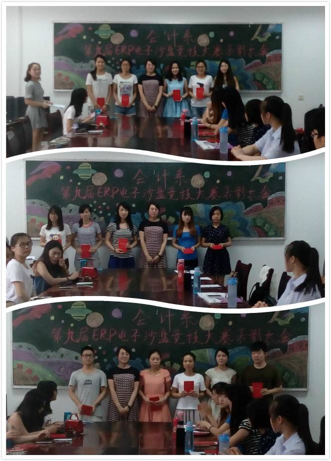 为了表彰在比赛中表现出色的学生,我系于6月22日在教学一号楼114举办了会计系第九届ERP电子沙盘竞技大赛颁奖仪式,此次颁奖仪式中出席的领导和老师有太阳网集团8722副院长兼会计系主任张欣副院长、会计系实践教研室闫本宗和张廷玉张老师,三位老师分别为获得一等奖、二等奖和三等奖的队伍进行了颁奖。