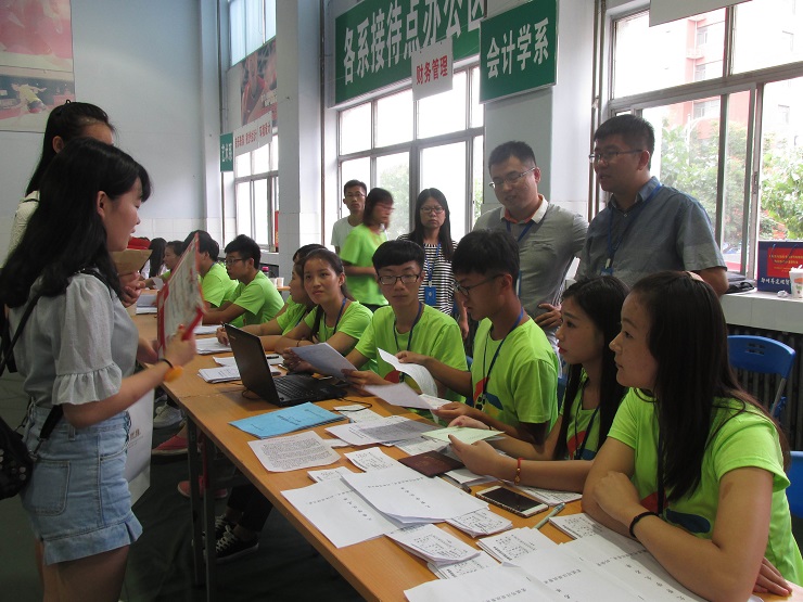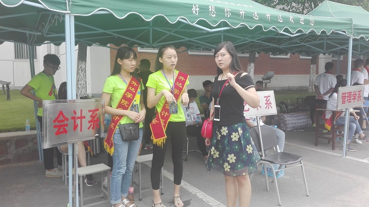 为保证迎新工作顺利完成,系领导老师们在学院迎新工作部署的基础上进一步细化了相关流程。9月3日当天早上7点,正式迎新工作就如火如荼地开始进行了:统一身着充满青春活力的荧光绿色T恤的团学会成员们悬挂横幅、搬桌椅、搭帐篷,做好各项准备。到处都是忙碌的身影。有的在行政楼旁举引导牌接待指引,有的在接待处耐心解答同学和家长们的疑问,有的微笑着热心地为新生办理各项手续,有的挥汗如雨,帮助新生运送行李,无论是在场的领导、老师还是同学们都能够满腔热情,细致入微。