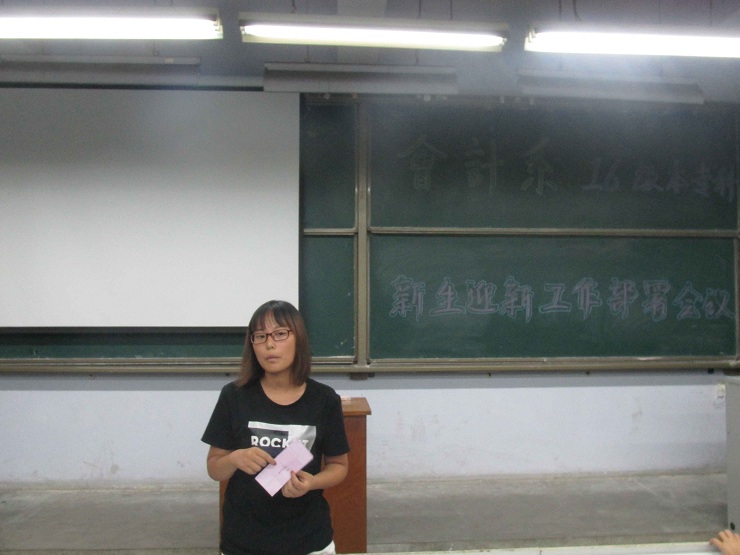 为迎接即将到来的16级本科及专科新同学,完满完成学校安排的工作。9月7号晚上7:10,会计系团学会在教学1号楼111教室举行了本专科迎新部署大会。 会计系团委副书记安琪、学生会主席安焱焱、还有全体主席团成员及全体部长及副部长参加了本次会议。