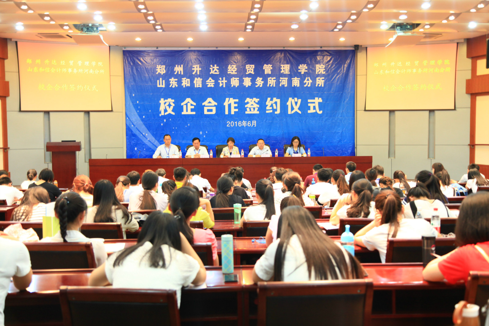 为大力推进校企合作人才培养模式改革,突出实践能力的培养,加强我院为地方和区域经济社会发展服务的能力,进一步深化校企合作融合度,更新教学理念,建立校企深度合作、优势互补、共同发展的合作机制,以提升我系教育教学水平和人才培养质量,努力开创校企合作的新局面。2016年6月20日,山东和信会计师事务所(河南分所)与我院校企合作协议签字仪式在行政楼国际会议厅举行。出席签约仪式的山东和信会计师事务所的领导有河南分所所长冯宏志先生,项目经理、我院优秀校友刘雁斌先生;我院出席领导有院长郭爱先教授、张金安副院长、张欣副院长、教务长吴益民教授、人事处张蕾处长、发规处沈定军处长和科研处杨存博处长等。仪式由院长办公室主任朱永恒主持,会计系部分教师及150余名审计学专业(注册会计师方向)的学生在现场见证了协议的签订。