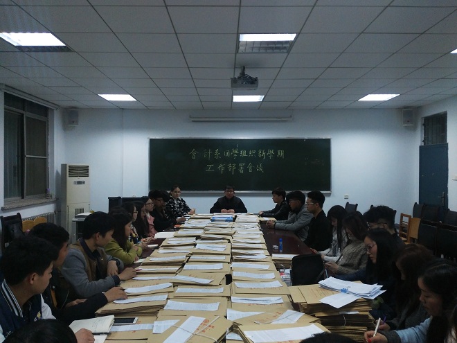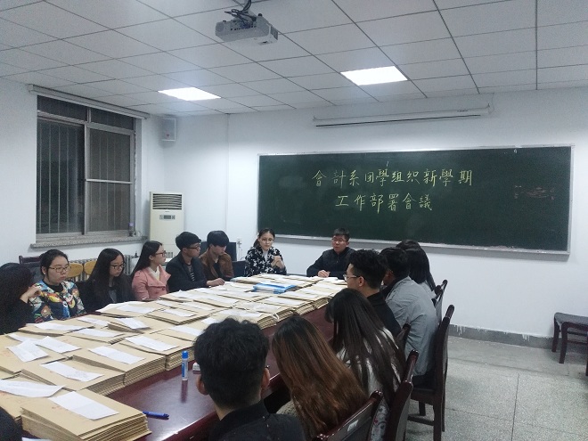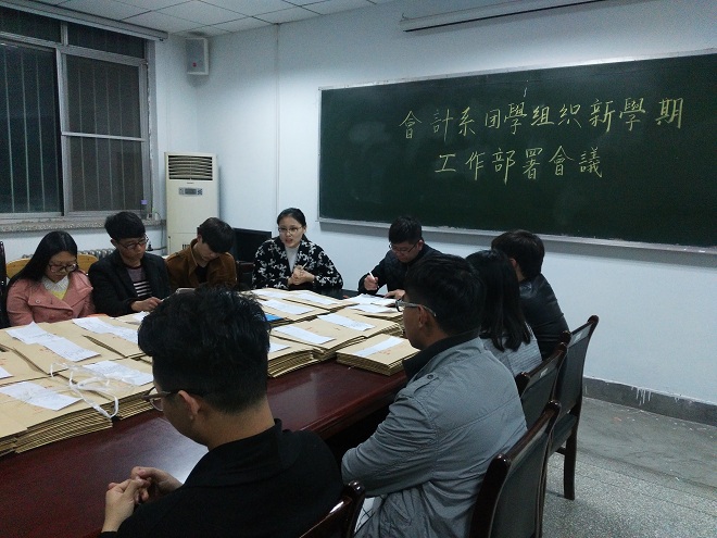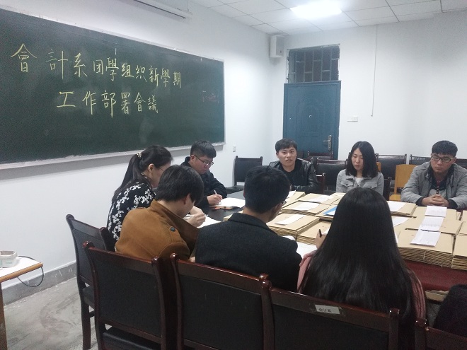 新学期伊始,为推动会计系团委学生会工作良好持续发展,3月3日晚6:50,会计系于教学一号楼114会议室召开了会计系团学组织新学期工作部署会议。会计系行政秘书兼团委书记陈刚老师,以团委副书记成磊、学生会主席汤嘉伟为代表的主席团成员,及各部门部长参加了此次会议。