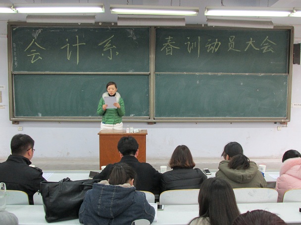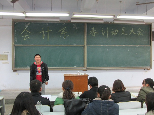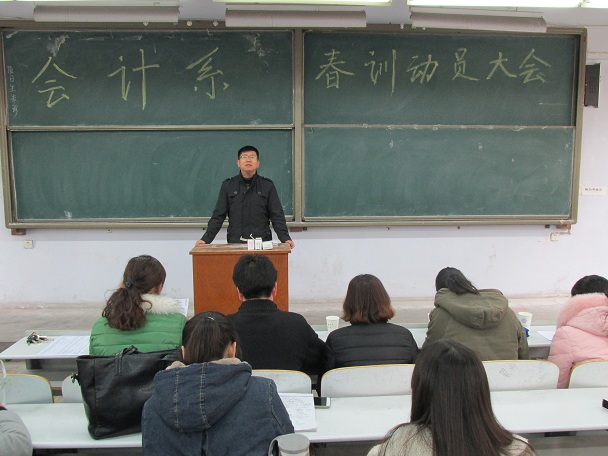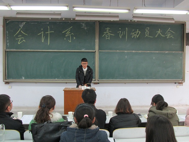 我运动,我自信,我健康,我快乐。为了调动运动员们参加体育锻炼的热情,加强自身锻炼。3月9日中午12:30,会计系春训动员大会于会计系1号楼108教室如期举行。莅临本次会议的嘉宾有会计系行政秘书兼团委书记陈刚老师、会计系行政秘书刘锦老师、会计系辅导员张巍炜老师、张涛老师、陈晓老师、李南方老师、陈姣老师、鲁玲玉老师、丁向育老师、郭俊东老师、杨煜老师以及团委副书记成磊、学生会主席汤嘉伟、学生会副主席温冉冉。