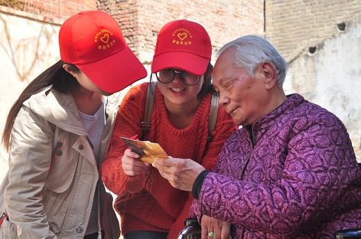 我们拿出自制的爱心贺卡,送给每一位爷爷奶奶,他们开心地接过,拉起我们的手,亲切地交谈。聊天中,我们得知,他们生活的非常开心,享受着如天伦般的乐趣,每天有规律的锻炼,和合理的膳食让他们看起来依旧是那么康健,平淡的话语中,透露着他们积极地生活和看到我们时难以抑制的开心。很少感受到爷爷奶奶关爱的我们,在这里得到了额外的幸福,他们像对待自己孩子般对待我们。