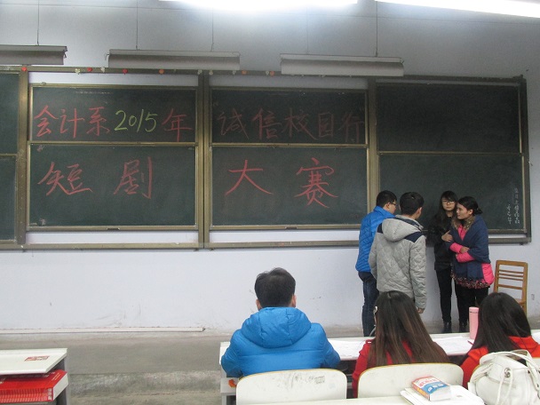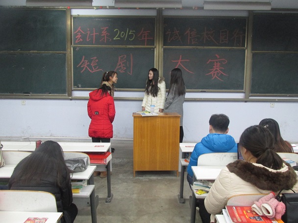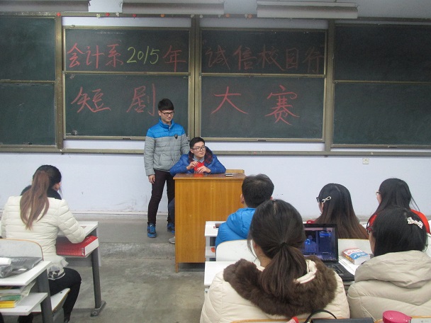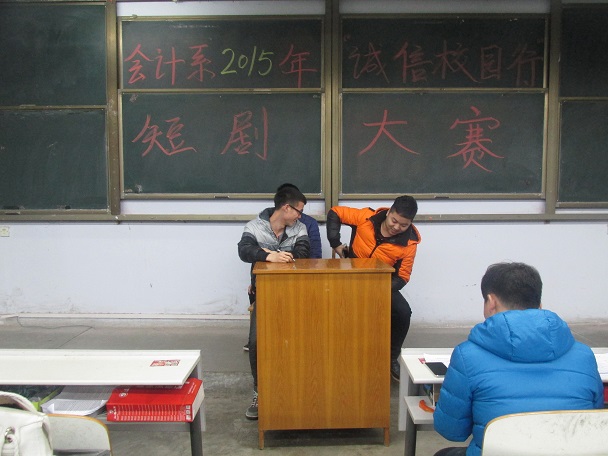 为了宣传国家资助政策及相关知识,培养广大学生的诚信观念,促进升达学生资助工作持续,健康发展。12月16日晚上6:30,由会计系政论部举办的“诚信校园行”校园话剧大赛于教学一号楼108教室顺利举行,当晚出席的嘉宾和评委有:会计系党务工作专员、辅导员彭丽老师,辅导员张振中老师,学生会主席汤嘉伟,团委书记助理乔志华、张雅,会计系通讯部部长王丹,活动受到会计系领导们的高度重视。