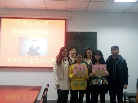 通过层层筛选,获得本次“贫困助学金”的分别是表现突出的13级会本二班李阳阳同学和13级会本五班杜玉莲同学,获奖的两位同学表示将把校友的关爱与领导老师的嘱托化作继续奋斗的动力,时刻以优秀校友为榜样。最后,由张欣主任,陈刚老师、刘锦老师为她们每人颁发500元贫困助学金,并合影留念。