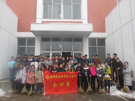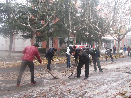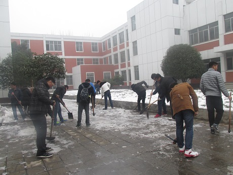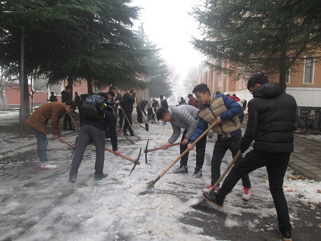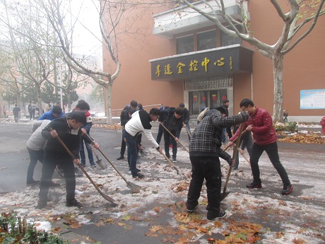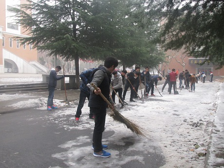 由于前段时间的大雪,路面很滑,积雪已经累积成冰,扫雪任务异常艰巨,会计系团学会干部不畏艰辛,顶着寒风,团结协作,将积雪清理干净。