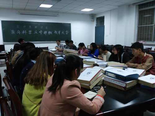 校园是传播科学文化的神圣殿堂,是培养社会人才和建设者的重要阵地。为提高大学生的明辨是非的能力,10月18号晚6:30,会计系于教学一号楼114会议室召开“反对邪教,崇尚科学”主题会议,行政秘书兼团委书记陈刚老师,以团委副书记成磊,学生会主席汤嘉伟,社联理事长张千为代表的主席团成员及各部门部长出席了本次会议。