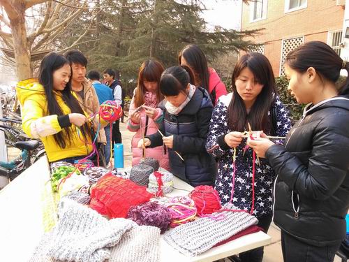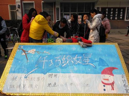 为丰富同学们的课余生活,教会同学们一些生活技能,2014年12月26日中午12:00,由会计系团委主办、生活部承办的“纤巧织女星,编织送温暖”活动在教学二号楼前如期举行。由我系邀请的校园编织能手聚在一起,给有意学习编织的同学们具体指导,为本次活动献出一己之力。