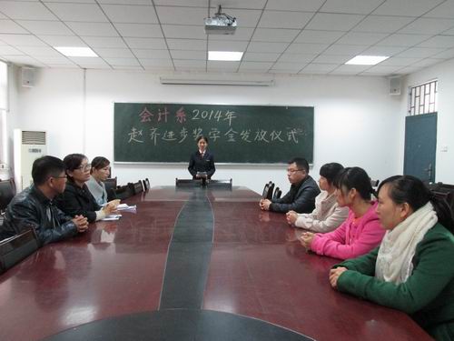 11月7日上午9:30,由会计系校友李征资助的2014年“赵齐进步奖学金”授奖仪式在教学一号楼114系会议室顺利举行。会计系主任张欣老师、行政秘书兼团委书记陈刚老师、行政秘书刘锦老师、辅导员陈勋、李艳艳老师和获奖同学参加了本次授奖仪式。