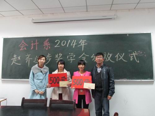会计系“赵齐进步奖学金”自2013年开始设立,由我院会计系2001级财本一班李征校友捐赠,李征校友现就职于浙江一家银行,事业成功,为表达对母校的感恩,鼓励在校师弟师妹的学习热情,同时纪念美好的大学时光、与同学赵齐在大学期间一起努力奋斗的岁月,特在母校会计系设立此奖学金,以鼓励在校师弟师妹努力学习、自强不息,为以后的发展做充分的准备。