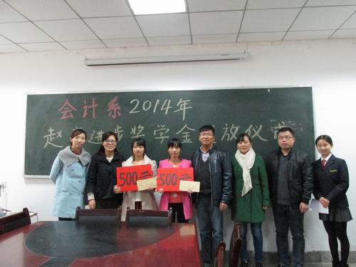按照资助者的意愿,通过层层筛选,获得本次“赵齐进步奖学金”的分别是表现突出、成绩进步较大的12级会本一班柴悦君同学和12级财本四班候迪同学,由陈刚老师、刘锦老师为他们每人颁发500元进步奖学金。同时,张主任对两位同学做出了希冀,希望两位同学发扬赵齐、李征精神,再接再厉,自强不息,将来事业有成。获奖的两位同学也表示将把校友的关爱和领导老师的嘱托化作继续奋斗的不懈动力。