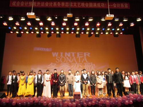 带着领导和老师的期许、关爱与祝福,带着会计系社团人的成城众志,2014年11月27日晚6:30,会计系2014年“冬季恋歌”社团风采展示文艺晚会在我院思源会馆闪亮登场。会计系行政秘书兼团委书记陈刚老师、行政秘书刘锦老师、西泰山村先锋幼儿园的领导及老师们、企管系吴文妍老师、我院外籍教师JON、会计系13级年级团总支书记李恒基老师、14级年级团总支书记海德威老师以及我系全体2014级新生辅导员老师、院社团联合会及各兄弟系社团联合会主要学生干部和我系近2000名新生一同观赏了本次晚会,整个思源会馆可谓座无虚席、气氛热烈。