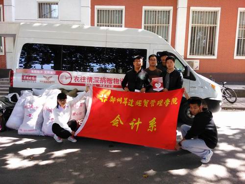 10月15日上午十点三十分,会计系与郑州晚报“衣往情深”公益项目组联合开展了“衣往情深,开启爱心”公益活动。“衣往情深”公益项目工作人员、会计系行政秘书兼团委书记陈刚老师、会计系学生会主席刘乾坤及系团学干部代表等共同参与了此次活动。
