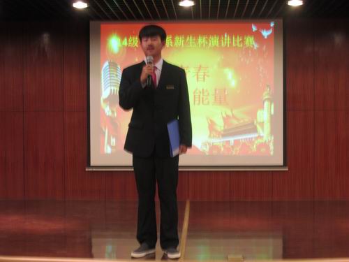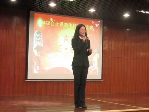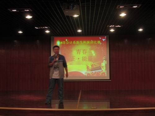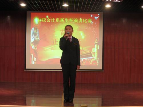 经过前期的初赛和复赛,10月16日下午6:30,会计系在外语楼A座二楼的多功能报告厅举行了由会计系团委主办、学艺部承办的以“传递青春正能量 践行社会主义核心价值观”为主题的2014年“新生杯”演讲比赛的决赛。出席此次比赛的嘉宾有会计系行政秘书兼团委书记陈刚老师,14级年级团总支书记、辅导员海德威老师。担任此次评委的有团委副书记王纯、学生会主席刘乾坤、学生会副主席王林林、会计系学艺部部长范宁宁、演讲队队长张晶晶、演讲队主力史珺、刘畅,2013年会计系演讲赛冠军任浩等人,各班拉拉队代表近300人到场观看了比赛。