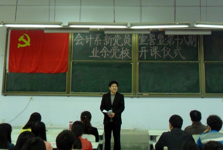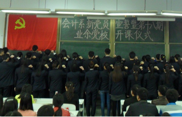 3月20日下午4:00,会计系在教学一号楼108教室隆重举行了会计系新党员宣誓暨第十八期业余党校开课仪式。会计系党总支书记朱建良、党总支副书记张红阳、党总支委员兼行政秘书刘锦以及各党支部书记出席了本次会议,大会由党务工作专员赵磊老师主持。