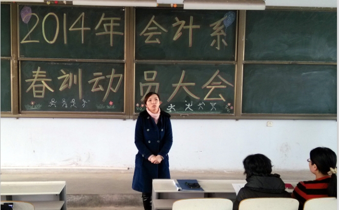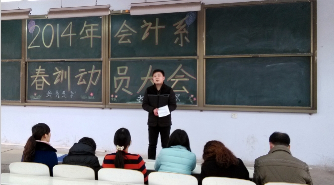 3月4日中午12:30,我系在教学一号楼108举行了“2014年会计系春训动员大会”,出席此次会议的有会计系行政秘书刘锦老师,会计系团委副书记焦阳老师,会计系田径队总教练李恒基老师,部分辅导员老师以及会计系全体运动员。