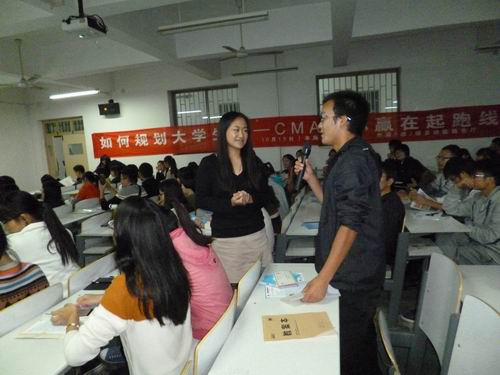 交流会开始后,蒋老师与大家进行了互动,让同学们很快融入到了现场热烈的气氛当中,然后蒋老师为大家讲解了有关CMA的专业知识,并指出参加CMA考试对我们来说是一个优势:相对于普通会计人员,拥有CMA证书的人员就业范围更广,发展机会更大,因为现在国内拥有此证书的人数较少,加大了它的含金量,并且CMA在企业、事业单位中应用都很广泛,如农行、中行等都开展了CMA的培训课程。另外,CMA考试形式也有所改革,它由原来的四科考试改为两科,教材有中文版和英文版,对参加CMA考试的考生来说更容易学习和通过。