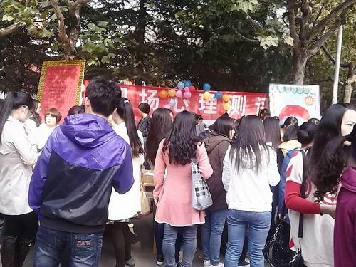 2013年10月24日下午两点,会计系组织学生在系2013级年级团总支书记李恒基老师和会计系心航路社团的带领下积极参加院心桥社在龙湖食府门前举办的大学生心理测评活动。
