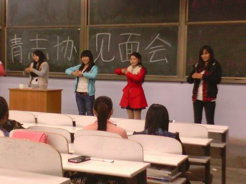 会议伊始,首先由社长表达了对新成员的热烈欢迎,并且介绍了青志协的基本情况,并由下设四个部门的部长分别详细介绍了本部的情况,并希望其他有意向的同学可以积极报名参加。为了活跃现场气氛,文艺部部长带领几位同学一起表演了手语节目——《可爱颂》,赢得了全场同学的掌声。