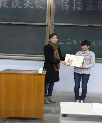 为鼓励王亚菲同学拾金不昧的精神,进一步弘扬中华民族传统美德,号召同学们向王亚菲同学学习,会计系行政秘书刘锦为王亚菲同学颁发了奖品,以资鼓励。颁发奖品之后,王亚菲同学发表了感言,她说这是她应该做的,也相信每一位同学遇到这种情况都会这么做,她会将这种正能量传播下去。