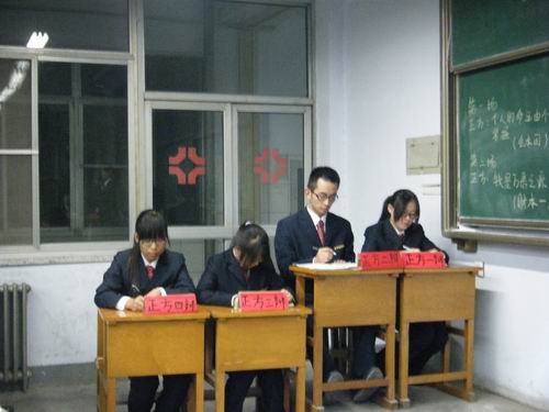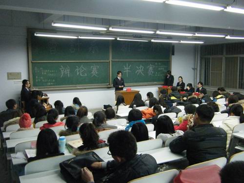 12月6日晚18点30分,由会计系学艺部主办的会计系新生辩论赛半决赛在教学1号楼111教室精彩上演。到场的嘉宾有学生会副主席潘盼、学艺部部长丁琳曦,评委有10级辩论队主力霍雨婷、余浩、李玉阳,11级辩论队队长张晓慧,11级辩论队主力李晶、王芦静、南向飞、梁冠毅,12级会计系各班拉拉队现场观赛。