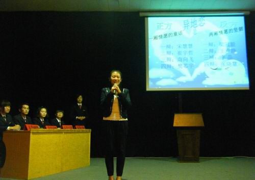 10月15日晚7:00,会计系2012级各班同学们欢聚一堂,在龙湖报告厅观看了由会计系学艺部主办的以“异地恋”为主题的辩论表演赛。会计系团委副书记焦阳老师、辅导员李明鸿老师、院社区学生会主席司方域、院辩论队队长刘英迪、会计系09级辩论队队长郑光辉、会计系学生会主席吴亚玮以及各兄弟系团学会成员和同学们一同观看了本场比赛,报告厅内座无虚席。