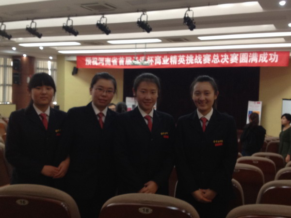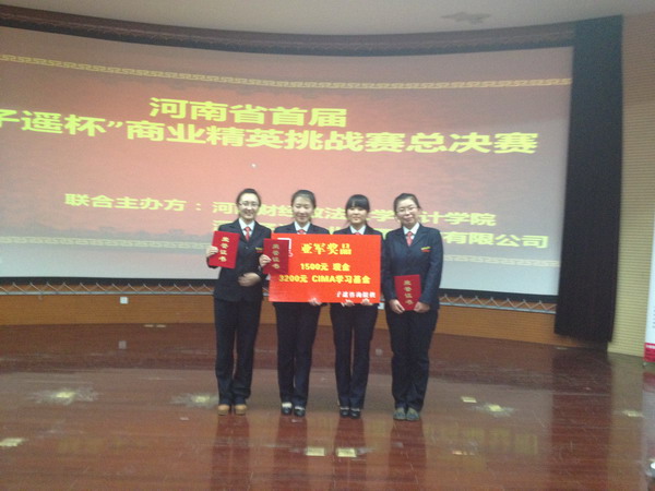 2012年11月2日十八点三十分,我院会计系10涉会1班学生赵旭,吴亚玮,崔白露,牛燕飞在会计系涉外会计教研组教师刘丹老师和郭崇老师的带领下参加了河南省首届“子遥杯”商业精英挑战赛总决赛。来自河南六所高校的代表队参加了此次决赛。经过激烈的角逐,我院代表队以卓越的表现力,精准的报告分析和机智的现场回答问题取得了亚军,获得奖金和奖品。冠军由东道主河南财经政法大学取得。郑州大学西亚斯国际学院团队获得季军,河南工业大学、河南工程管理学院和郑州航天航空管理学院分别获得优秀奖。