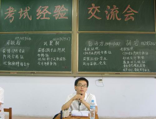胡岩、彭西方、王莹莉同学重点介绍了如何复习备考的方法和技巧;赵阳立同学从拿破伦·希尔的17条成功法则入手,强调了成功必备的条件;马颖超、巩聚朝同学则主要与学弟学妹们分享了从业之后的实际经验。他们都一致强调考证必须要有明确的目标、持之以恒的毅力,要学会合理安排时间,选择科学的学习方法,积极自主的学习,当然也建议同学们要依照自己不同的性格特点和需求,有针对性的选择适合自己的证照考试方法。然后,他们还对大家提出的问题进行了热情耐心细致地回答,解除了大家很多的顾虑和疑惑。最后本次证照交流会在一阵阵热烈的掌声中进入了尾声。