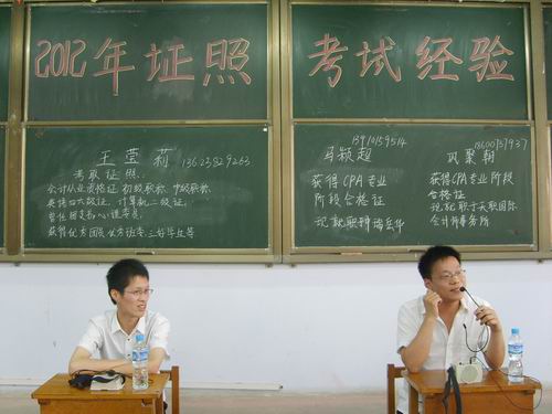 本次交流会邀请了目前就职北京天职国际会计师事务所和中瑞岳华会计师事务所的2007级已经毕业获得注册会计师专业阶段合格证的马颖超和巩聚朝同学、2008级取得注册会计师专业阶段合格证的优秀毕业生胡岩和彭西方同学,以及在注册会计师专业阶段通过五门单科考试的赵阳立和通过中级职称考试的王莹莉同学,他们采用诙谐幽默、深入浅出的方式向学弟学妹们真诚介绍并分享了自己考取证照方面的经验和技巧。
