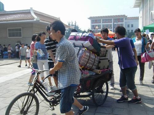 引导员们个个身披绶带,精神抖擞,带领刚到校的新生到各个工作点依次办理相关手续。从查验证件、核对信息到发放程序单、缴费单,再到办理注册、安排宿舍,直到将新生的行李物品用三轮车送到指定宿舍,整个过程着实让我们的团学干部和志愿者们汗流浃背,但他们的脸上洋溢着的是欣慰的笑容,留给新生和家长们的也是家人一样的温暖。在办理手续的过程中,他们还热情地与新生交流大学经验,提出合理化的建议,介绍我院及我系的一些情况,以便于新生能快速的适应大学生活,完成人生的第一个转折。
