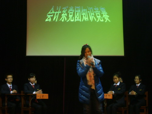 3月21日下午6:30,由会计系团委主办,会计系政论部承办的"党团知识竞赛"在龙湖报告厅举行。参加本次活动的有11级会本三班、11级涉会二班等七个班级,会计系团委常务副书记焦阳老师,辅导员陈姣、李明鸿老师以及会计系团委副书记罗丹、学生会主席程振宇等学生干部作为嘉宾出席了本次比赛。