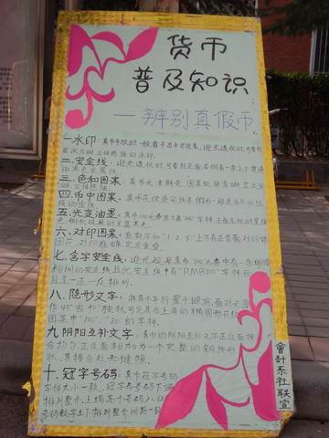为了使同学们更加了解货币相关知识和辨别货币真伪的方法,在院团委主办、会计系团委承办的我院第一届中博杯“金手指”大赛活动期间,会计系团委制做了相关的展板和图片,开展了货币知识普及活动。
