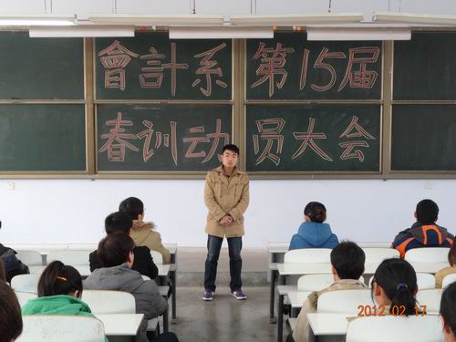 2月17日中午12:40,会计系春训动员大会在教学一号楼108教室如期举行。出席此次大会的有会计系行政秘书兼团委书记陈刚老师、行政秘书助理刘锦老师、团委常务副书记焦阳老师、田径队总教练王彬老师以及2011级辅导员高晓阳、李南方、陈姣、赵磊等老师。此外,会计系田径队运动员及团学干部百余人参加了大会。