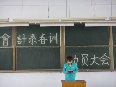 3月4日下午,教学一号楼108教室掌声阵阵,会计系2011年春训动员大会在这里如期举行。参加此次大会的有会计系团委书记兼行政秘书郑晶老师、会计系团委常务副书记焦阳老师、会计系主席团成员、体育部成员及系田径队全体成员。