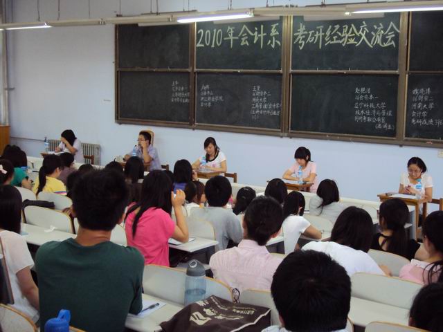5月29日下午15:00,会计系2010年考研经验交流会在1号楼108隆重举行。考取上海财经大学的王华、考取浙江财经学院的卢开熙、考取湖南大学的王贤、考取辽宁科技大学的赵艳洁(同时考取了选调生)、考取河南大学的魏晓博五位同学与来自大二大三有意向考研的学弟学妹们共二百余人共同参加了交流会,他们就考研的经验进行了充分的交流。