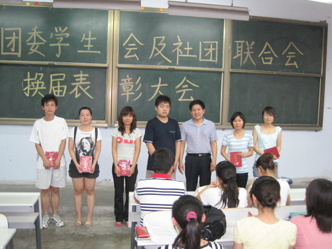 在激昂的共青团歌之后,主持人宣布表彰大会正式开始。到会的老师们分别为15届团学会优秀部门、优秀部长、副部长、优秀干事等集体和个人颁发了荣誉证书和奖品;团委书记郑晶和副书记焦阳为新一届上任的主席团及各部长、社长颁发了聘书,看着火红的聘书,同学们的心情激动万分。