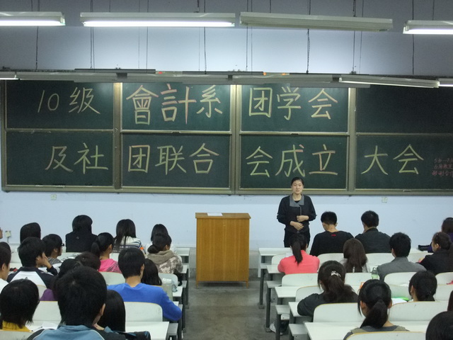 首先,由会计系团委书记郑晶老师致词,她向新加入的团学干事们表示衷心的欢迎和热烈的祝贺,指出2010级是具有较高素质的一届学生,而新干事们又是经过初试、复试的层层选拔脱颖而出的,因此,对他们给予极大的期望,同时对所有团学干事提出了要求:1、会计系团学会及社团联合会是一个服务广大学生的机构,因此大家要有服务的意识和态度;2、要妥善处理好与任课老师、辅导员老师及同学之间的关系,不搞特殊化,关心系内和班级事务;3、作为学生,学习是大家的首要任务,要求每个团学干部要正确对待学习和工作,努力提高学习成绩,为其他同学做好榜样;4、每位团学成员都要利用团学会的平台发展和提高自己各方面的综合素质,为以后的就业打下坚实的基础。