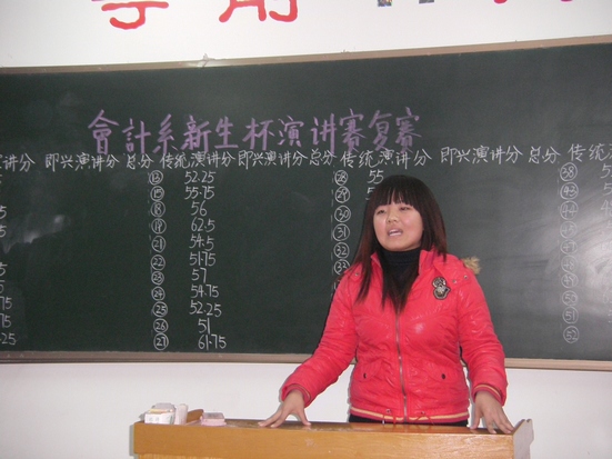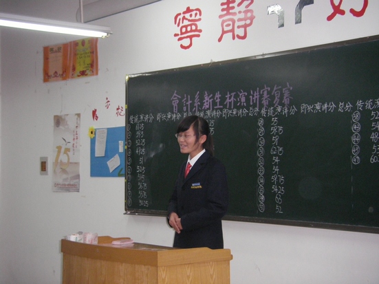 本次大赛的评委由会计系团委书记郑晶老师、团委副书记刘锦老师以及学生会主要干部组成。大赛分为传统演讲和即兴演讲两个环节。在费翔和张梦歌的主持下,比赛井然有序。台上激情盎然,台下肃静专注,整个赛场呈现出一种激烈而和谐的气氛。新生选手们带着自信的微笑,用实力彰显出会计系新生的风采。最终09会本四班孟祥蕊获得一等奖;09会本一班张琼、09涉会本二班郝治林获得二等奖;09会本一郭雪梅班、09会电专三杨奕班获得三等奖。