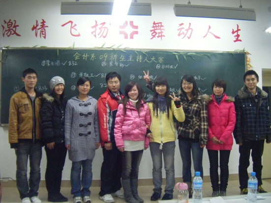 在文艺部的精心组织下,比赛精彩而有序地进行。大赛分为自我介绍,才艺展示,妙语连珠以及模拟主持四个环节。悠扬的歌声,散文、诗歌朗诵的抑扬顿挫,使在场观看的同学们惊叹不已,现场掌声一阵高过一阵。选手们个个反应灵敏,妙语连连,无论是个人秀还是团队演示,选手们都能尽情展示风采,争做舞台的主人。最终09财本一班罗丹获得一等奖;09会本四班管飞鸿,09涉会本二班冯时获得二等奖;09财本一班张禹,09会电专一班张萌、09会电专二班单敬兰获得三等奖。