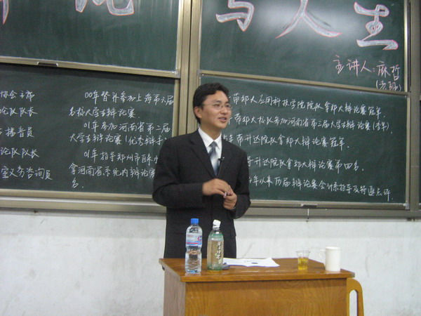 报告会以麻哲老师精彩的自我介绍开始。麻老师首先介绍了不同名字、不同性格在不同场合如何进行自我介绍才能给听众留下良好的第一印象的问题;接着通过对历届国际国内大专辩论赛决赛辨题的精辟分析,详细地介绍了辩论赛的流程、规则、模式以及技巧,使同学们对辩论赛这样一种语言交锋、思想碰撞的活动形式有了较为全面的了解;最后,麻哲老师由辩论谈到人生,讲述了辩论对他个人成长所起到的巨大作用,以及如何用辩证的观点来审视、解决人生中所遇到的种种问题。